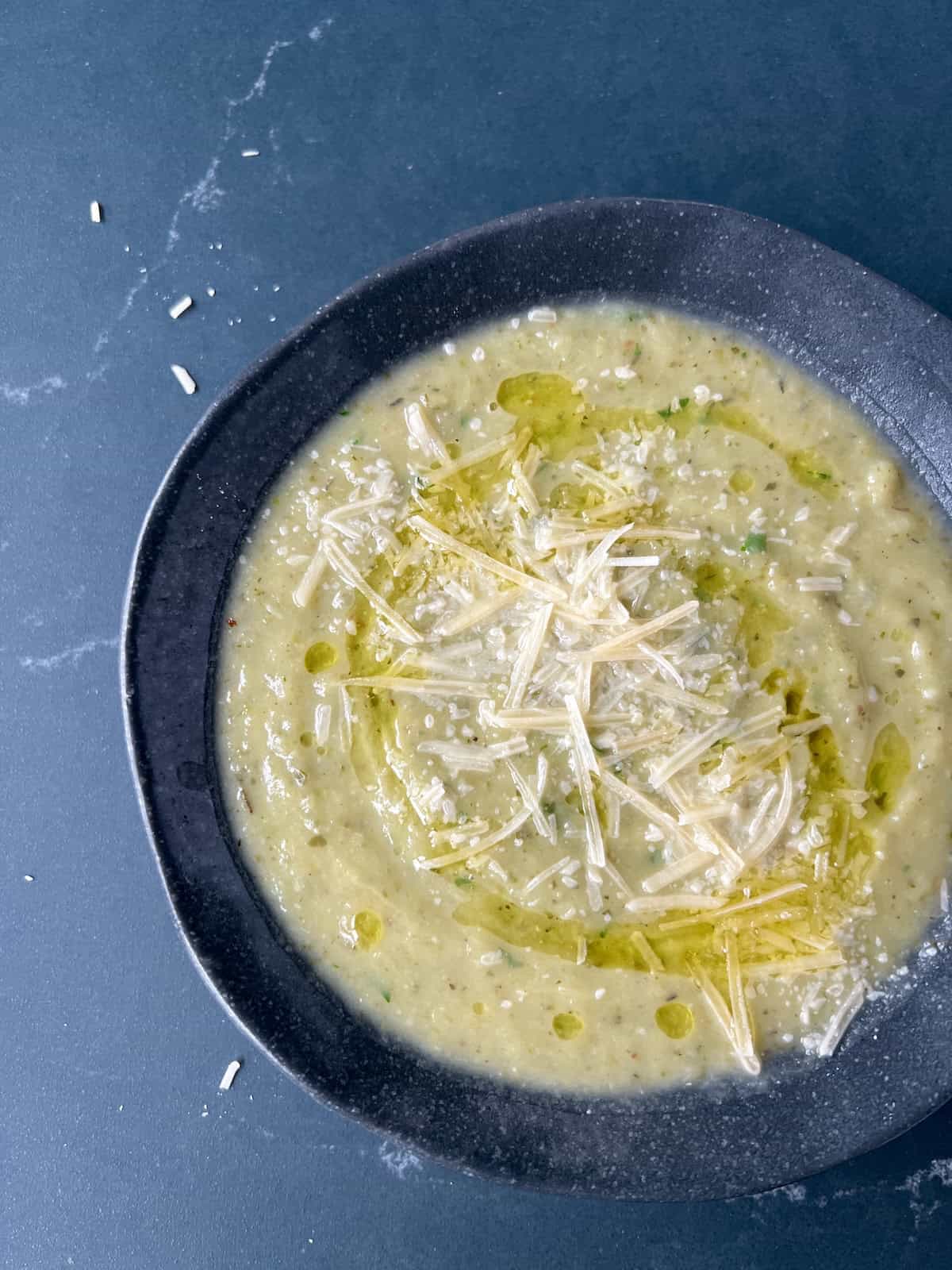 - Ladle your zucchini leek soup into bowls, garnishing each with a beautiful drizzle of olive oil and sprinkle of parmigiano to serve!